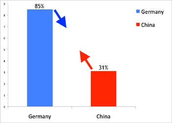 Als Beispiel dienen die organisatorischen Konditionen. In der Studie wird untersucht, wie sie das Verhalten der Mitarbeiter beeinflussen (Themenfeld 1 Organisation). Das Ergebnis zeigt, dass deutsche und chinesische Unternehmen eine klassische Organisationsstruktur haben und die Merkmale hierarchischer Strukturen und Funktionsorientierung besitzen (1 von 10 auf der Bewertungsskala). Bei der Umsetzung des Projekts bzw. im Arbeitsalltag schalten die Deutschen jedoch um und arbeiten mehrheitlich prozessorientiert. Die Kommunikation ist abteilungsübergreifend (horizontal) und die Kompetenz hat in der Regel Vorrang vor der Funktion (5 von 10 auf der Bewertungsskala). Die Chinesen hingegen halten bei der Ausführung der Aufgaben unbeirrt an der vorgegebenen Struktur fest und bemühen sich in Konfliktsituationen in erster Linie, die Hierarchie aufrechtzuerhalten (1 von 10 auf der Bewertungsskala). Die geschäftliche Kommunikation weist eine vertikale Struktur auf.
